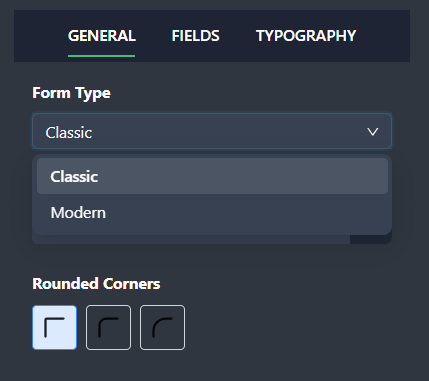 - Under the GENERAL tab, you’ll find the Form Type option.Choose between Classic or Modern, and preview the changes in real time.
